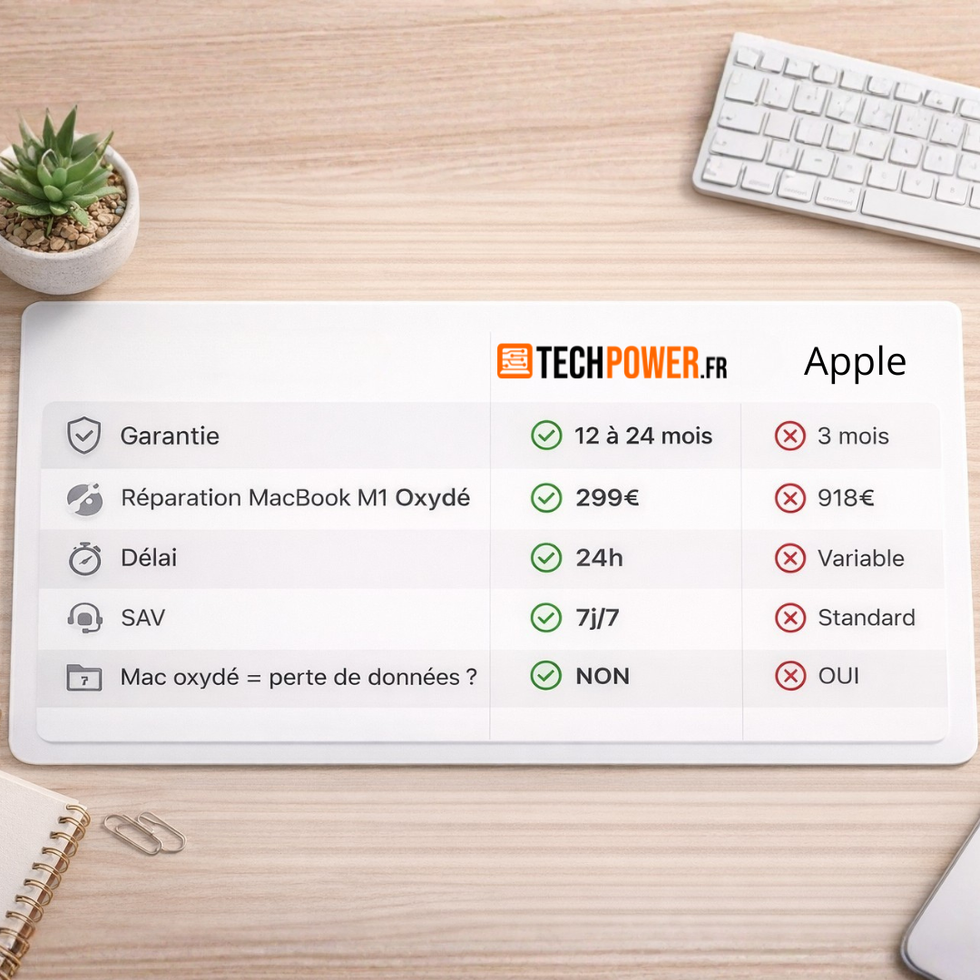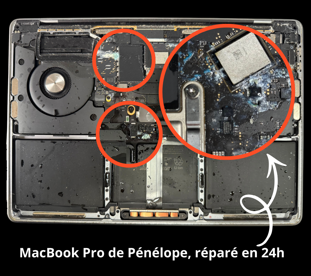 Face à l'oxydation, là où Apple propose un remplacement, nous intervenons directement sur les pièces touchées uniquement.